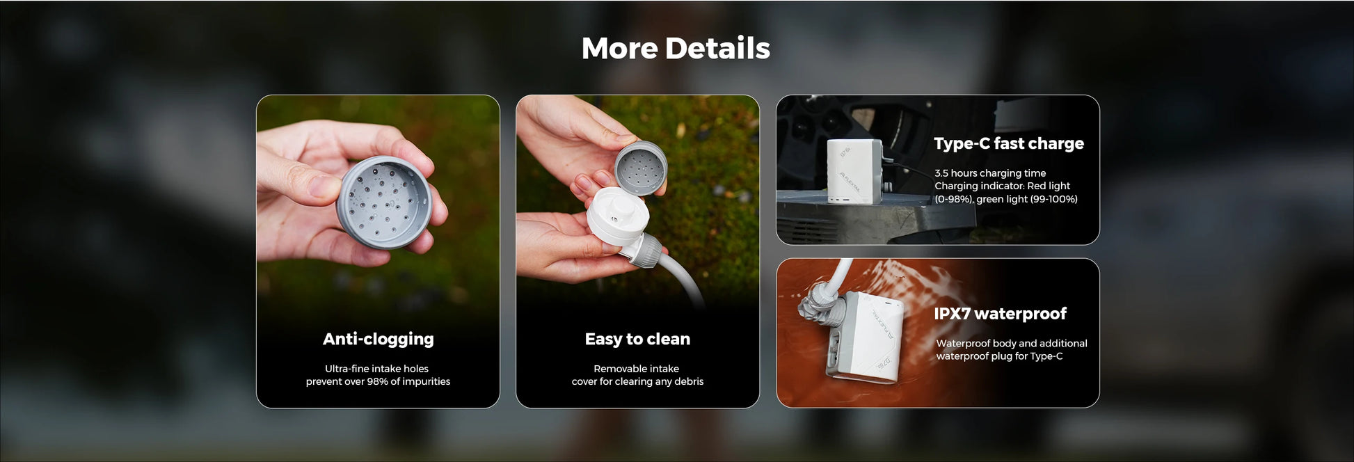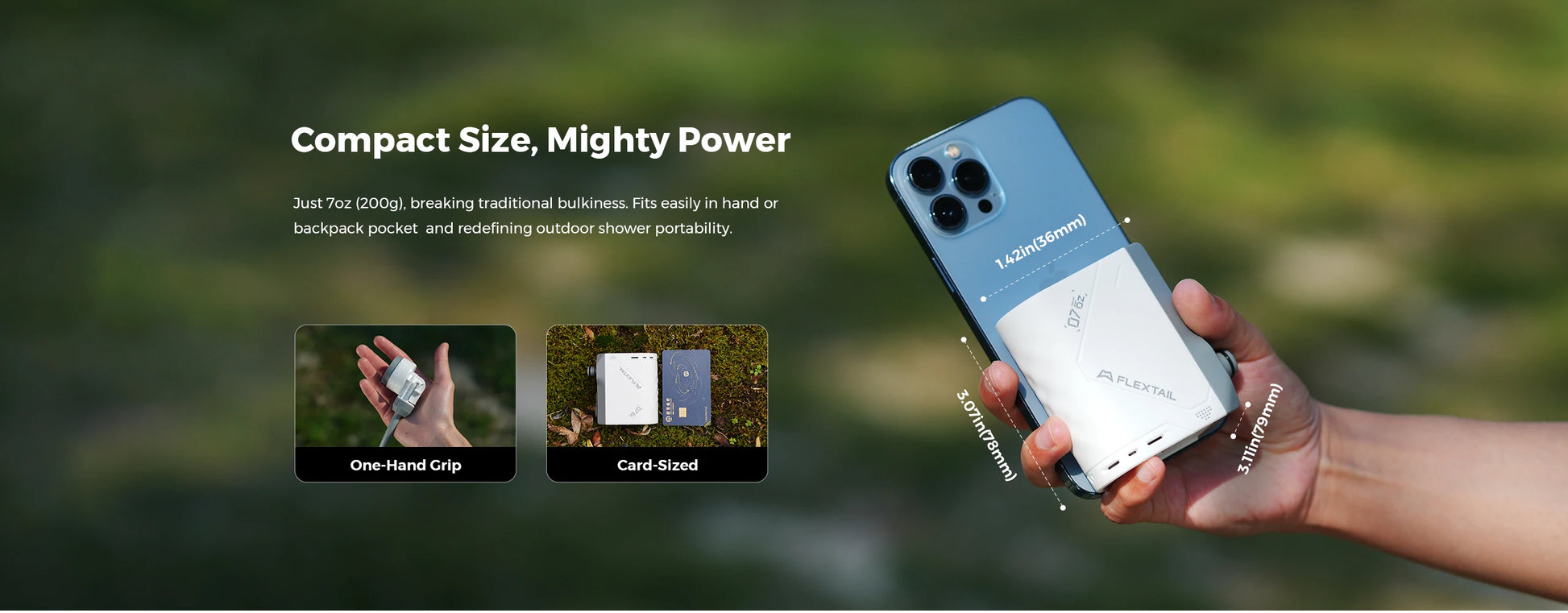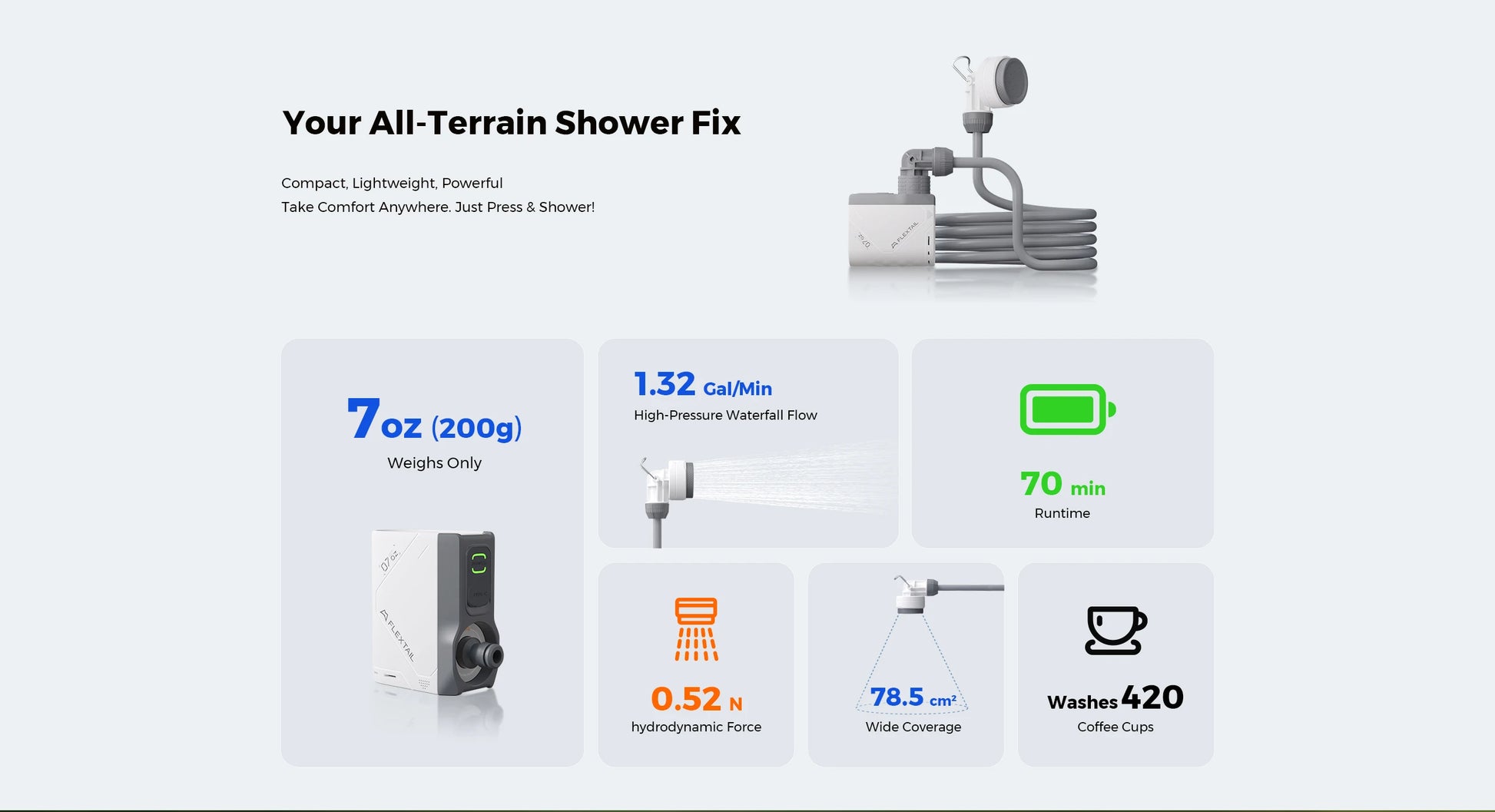 لو إنك تحب الطلعات والكشتات أو حتى تحتاج شيء عملي لتنظيف سريع في البيت أو الحوش، دش FLEXTAIL TINY SHOWER بيكون رفيقك المثالي. حجمه صغير ويعتبر خفيف مره (بس 200 جرام)، ومع كذا يعطيك قوة دفع ممتازة أفضل من أغلب الدشوش اللي بالسوق. فيه وضعيتين للرش، وحدة قوية مدتها 35 دقيقة والثانية أخف بس تستمر معك 70 دقيقة، وكلها تتشحن بسرعة عن طريق تايب C. مقاوم للمويه بمعيار IPX7 وما يحتاج له أي تعقيد في التشغيل، بس اشبكه وخذه معك. تقدر تستخدمه للغسيل، التنظيف، وحتى للحيوانات الأليفة. باختصار، هذا الدش عملي، مريح، وخيار ممتاز للرحلات أو الاستخدام اليومي.